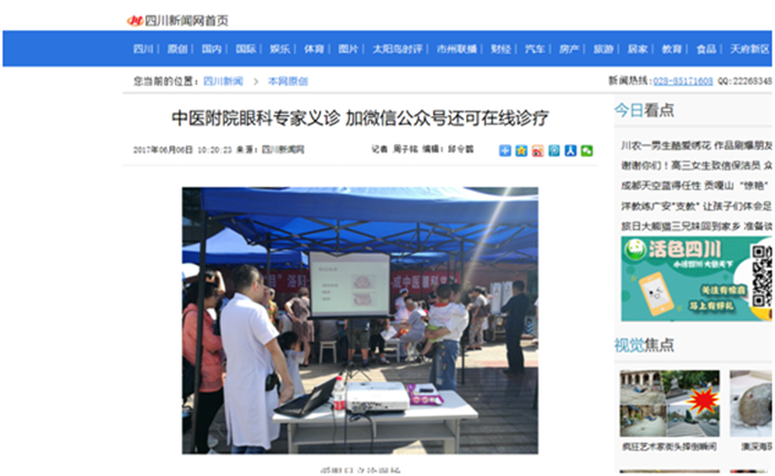 四川新闻网成都6月6日讯(记者周子铭)2017年6月6日是第22个全国爱眼日。四川新闻网记者从pp电子官方网站附属医院获悉,6月5日上午,为进一步普及科学用眼知识,预防屈光不正,提高全民视力健康水平,pp电子官方网站附属医院(四川省中医院)眼科携手院内眼科专家举行大型义诊,并通过医院互联网名医馆眼科门诊同步进行免费在线问诊,市民只需要搜索关注“成中医互联网名医馆”微信公众号,按提示即可完成在线诊疗。