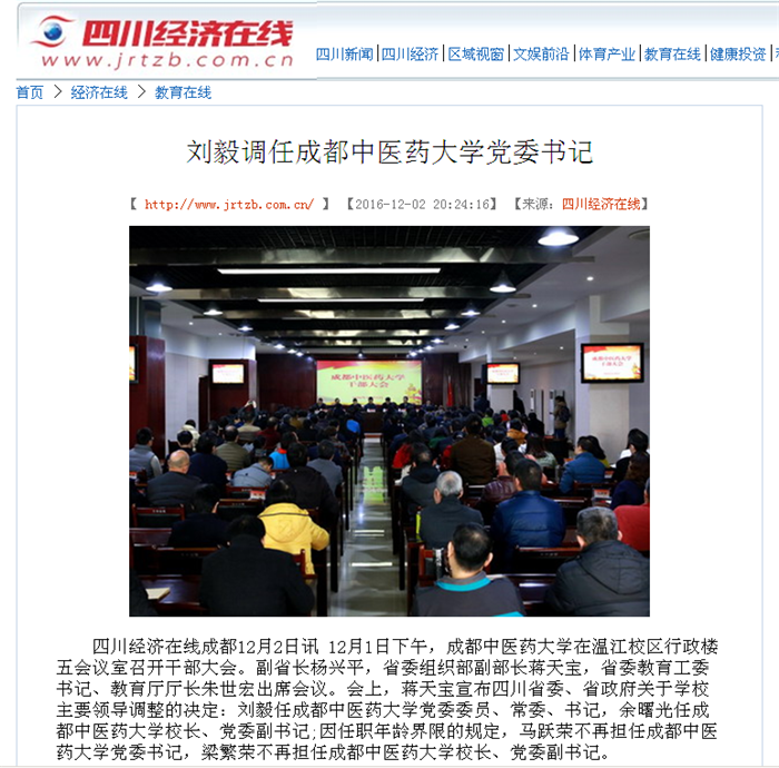 四川经济在线成都12月2日讯 12月1日下午,pp电子官方网站在温江校区行政楼五会议室召开干部大会。副省长杨兴平,省委组织部副部长蒋天宝,省委教育工委书记、教育厅厅长朱世宏出席会议。会上,蒋天宝宣布四川省委、省政府关于学校主要领导调整的决定:刘毅任pp电子官方网站党委委员、常委、书记,余曙光任pp电子官方网站校长、党委副书记;因任职年龄界限的规定,马跃荣不再担任pp电子官方网站党委书记,梁繁荣不再担任pp电子官方网站校长、党委副书记。