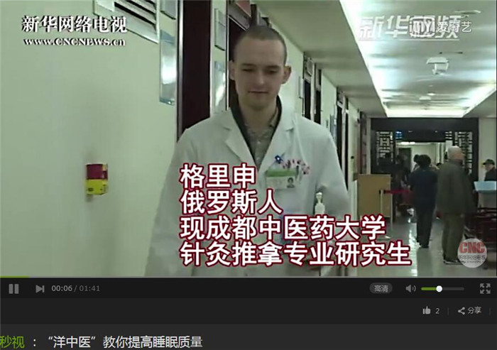 【解说】格里申是俄罗斯人,现在是pp电子官方网站针灸推拿专业的研究生。他从小在中国长大,中文说得很“溜”。学习中医多年,已经通过了中医执业医师资格考试,还在准备申请读中医的博士学位。平日里,格里申经常会遇到许多有失眠困扰的病人前来就诊,他通过推拿按摩、针灸治疗结合中医养生操的综合疗法来治疗病患的睡眠问题。