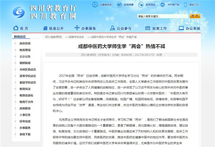 2017年全国“两会”已经闭幕,pp电子官方网站师生学习讨论“两会”的热情依然不减。两会期间,习近平总书记和其他中央领导同志以及政府工作报告、全国人大常委会工作报告对中医药改革发展作了全面部署,进一步突出了人民健康的战略地位,进一步体现了以习近平同志为核心的党中央对中医药事业发展的高度重视和亲切关怀。特别是总书记参加四川代表团审议时再一次点赞中医药:“中医药大有可为,好好干!”这些都让师生备受鼓舞,深感振奋。校园广播、校园网络电视、微博微信,校报等校园平台持续为师生开放“发声”通道,表达他们关注教育,关注中医药发展的心情和立志推动学校发展的自信和决心。