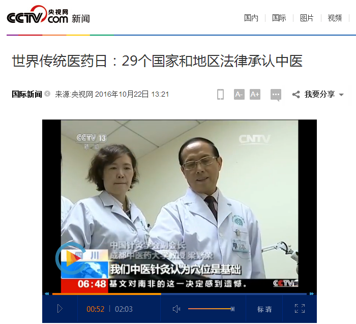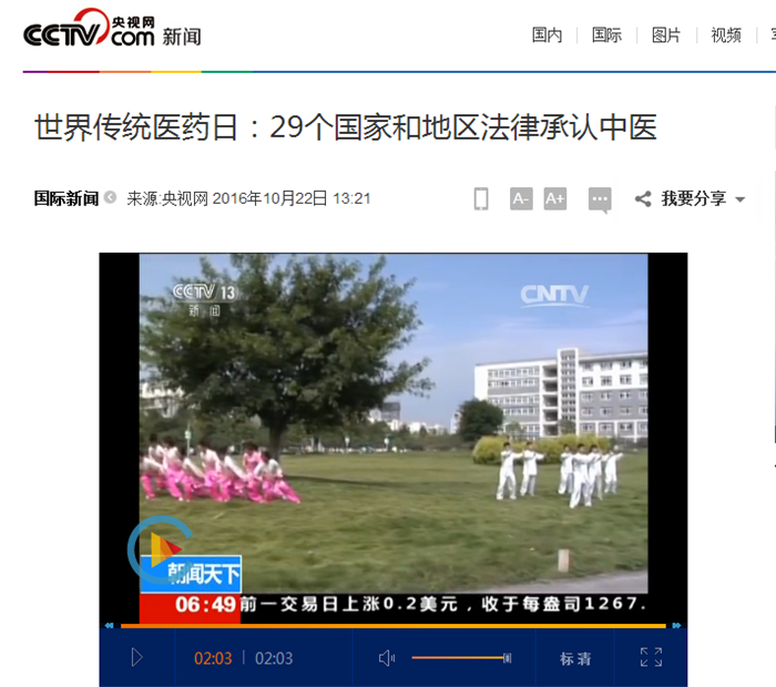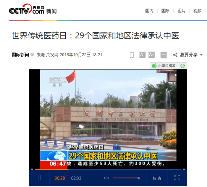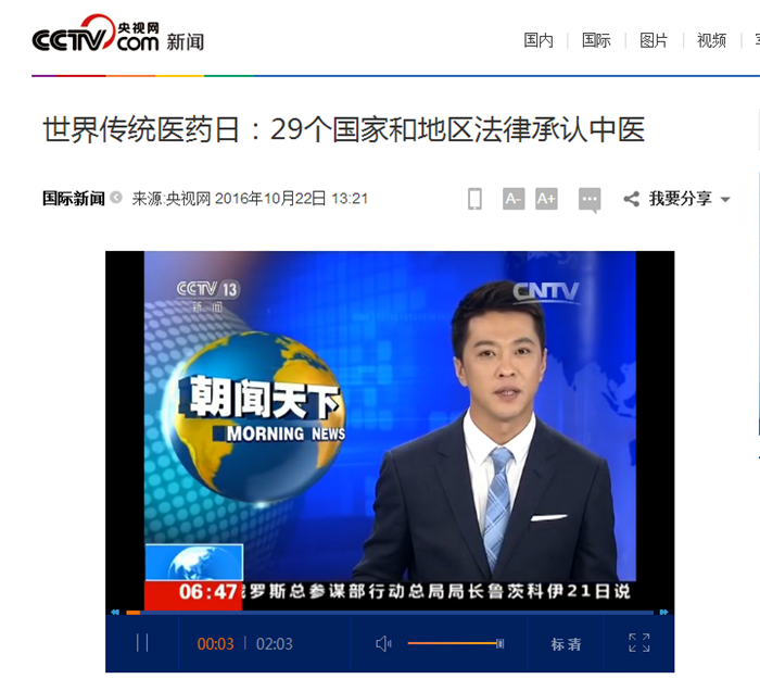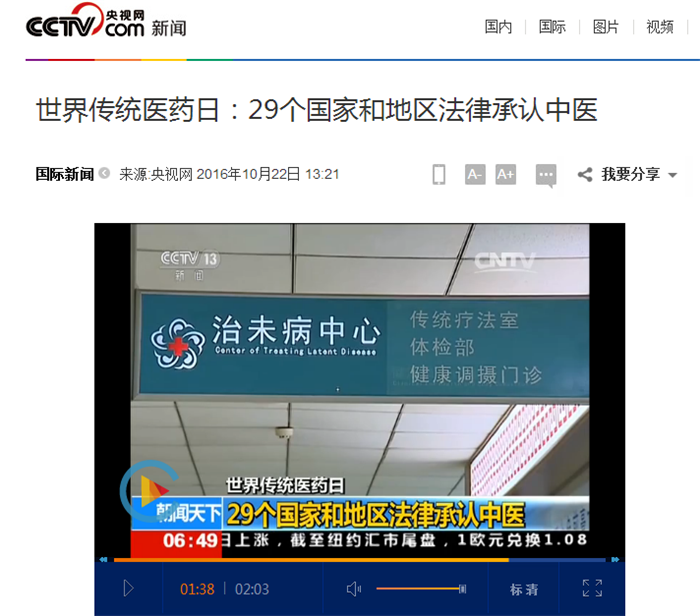 中央电视台《朝闻天下》:世界传统医药日 29个国家和地区法律承认中医 发布时间:2016-10-25 00:00:00 浏览次数: 次 【字体:小 大】 时间:2016年10月22日 来源:中央电视台《朝闻天下》 链接: http://news.cctv.com/2016/10/22/ARTIUaHLOWUUCGMrekKFyIjt161022.shtml?from=singlemessage&isappinstalled=0#10006-weixin-1-52626-6b3bffd01fdde4900130bc5a2751b6d1 内容: 世界传统医药日:29个国家和地区法律承认中医 【打印正文】 上一条:中央电视台《朝闻天下》:《“健康中国2030”规划纲要》—防慢病 治未病 下一条:国际在线:pp电子官方网站建校60周年 开启打造顶尖中医药高等学府新征程