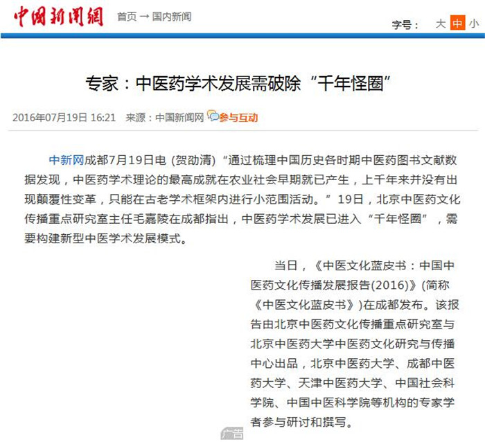 中新网成都7月19日电 (贺劭清)“通过梳理中国历史各时期中医药图书文献数据发现,中医药学术理论的最高成就在农业社会早期就已产生,上千年来并没有出现颠覆性变革,只能在古老学术框架内进行小范围活动。”19日,北京中医药文化传播重点研究室主任毛嘉陵在成都指出,中医药学术发展已进入“千年怪圈”,需要构建新型中医学术发展模式。