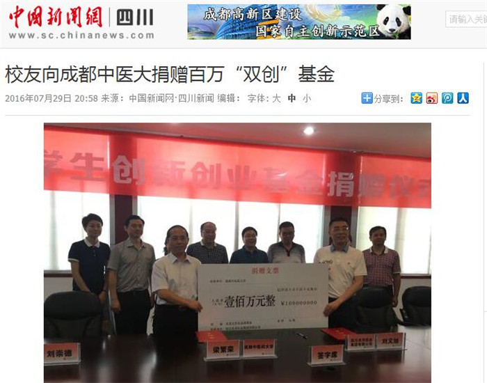 中新四川网7月29日电 (贺劭清)29日,pp电子官方网站60周年校庆即将来临之际,pp电子官方网站校友刘文旭向母校捐赠100万元人民币,作为该校大学生创新创业基金。