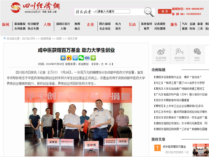 四川经济日报讯(记者 王万川) 7月29日,一份百万元的捐赠协议在pp电子官方网站签署,宣告专项帮扶有志于中医药领域创新创业的禾邦大学生创业基金正式成立,该基金将用于资助pp电子官方网站具有创业精神和能力、做好创业准备、具有创业项目的在校大学生。