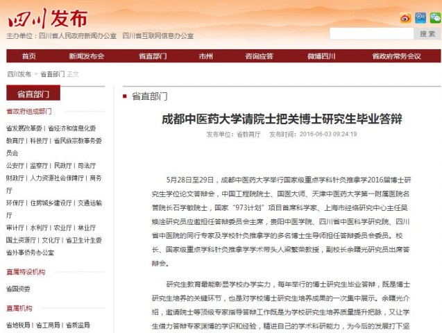 5月28日至29日,pp电子官方网站举行国家级重点学科针灸推拿学2016届博士研究生学位论文答辩会,中国工程院院士、国医大师、天津中医药大学第一附属医院名誉院长石学敏院士,国家“973计划”项目首席科学家、上海市经络研究中心主任吴焕淦研究员应邀担任答辩委员会主席,贵阳中医学院、四川省中医科学研究院、四川省中医院的同行专家及学校针灸推拿学的多名博士生导师担任答辩委员会委员。校长、国家级重点学科针灸推拿学学术带头人梁繁荣教授,副校长余曙光研究员出席答辩会。