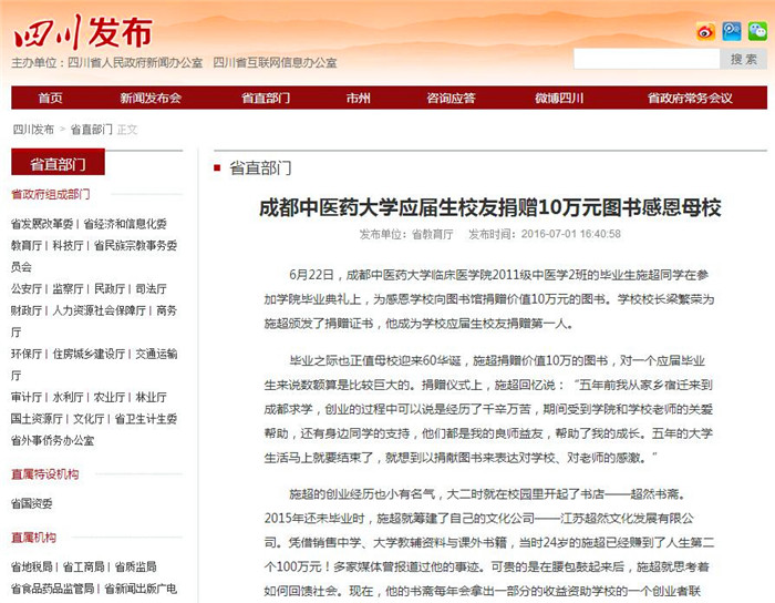 毕业之际也正值母校迎来60华诞,施超捐赠价值10万的图书,对一个应届毕业生来说数额算是比较巨大的。捐赠仪式上,施超回忆说:“五年前我从家乡宿迁来到成都求学,创业的过程中可以说是经历了千辛万苦,期间受到学院和学校老师的关爱帮助,还有身边同学的支持,他们都是我的良师益友,帮助了我的成长。五年的大学生活马上就要结束了,就想到以捐献图书来表达对学校、对老师的感激。”