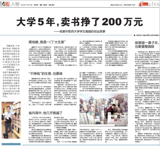 大学期间,在宿 舍楼下摆地摊卖书, 与校内茶餐厅合作 开实体书店,到全省 各地的高中学校推 销教辅资料,pp电子官方网站临床医学 院 2011 级中医 2 班(五年制本科)的施 超靠卖书挣了近200 万元。