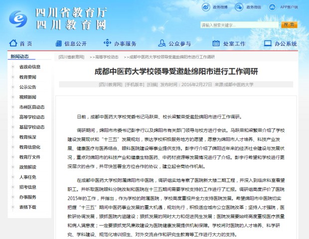 在pp电子官方网站校附属绵阳市中医院,调研组实地考察了医院新大楼二期工程,并深入到临床科室看望职工。并听取医院眼科分院改制和医院在十三五期间需要学校支持的工作进行了汇报。调研组高度评价了医院2015年的工作,并指出,作为学校的附属医院,学校高度重视并全力支持医院发展。希望绵阳市中医院切实把握“十三五”期间中医药事业发展的重大机遇,规划先行,积极适应城市公立医院改革;坚持人才强院,医教研协调发展,狠抓医院内涵建设;狠抓发展的同时大力和促进民生发展;医院发展要始终高度重视医疗质量和病人满意度;一定要狠抓党风廉政建设为医院健康发展提供机制保障。学校将对医院的人才培养、科学研究、学科建设、规范化培训招生、对外交流合作和研究生教育等工作进行大力的支持。