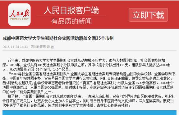 “2015寻找全国百强暑期社会实践团队”全国大学生暑期社会实践专项活动是由团中央学校部、全国学联秘书处、中国青年报共同主办,旨在号召全国大学生进行公益实践,向社会传递正能量,倡导公益从身边点滴做起。自6月活动发起以来,由学校青年志愿者协会组织的“青翼”暑期社会实践小分队从全国1600余所高校,8000余个项目中脱颖而出,入围全国1000强团队。经过线上投票,专家评审等环节后成功获评全国百强暑期社会实践团队中的30个“优秀实践团队”之一。