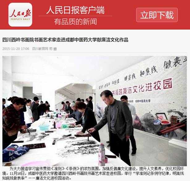 据了解,在四川西岭书画院院长、原四川省人民政府副省长徐世群的关心和支持下,委托由原四川省人大副主任、四川省老年书画研究会常务副会长李洪仁和西岭书画院常务副院长孙灵根带队,周家兰、卢成春、吴家富、蒲生龙等12位书画艺术家们现场创作以廉洁文化为主题的艺术作品,并将33件精美的艺术作品捐赠给学校作为永久展出。
