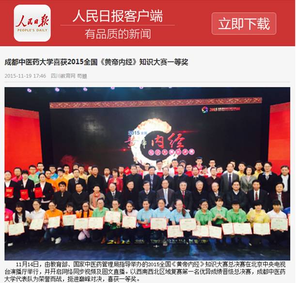 11月14日,由教育部、国家中医药管理局指导举办的2015全国《黄帝内经》知识大赛总决赛在北京中央电视台演播厅举行,并开启网络同步视频及图文直播。以西南西北区域复赛第一名优异成绩晋级总决赛,pp电子官方网站代表队为荣誉而战,挺进巅峰对决,喜获一等奖。