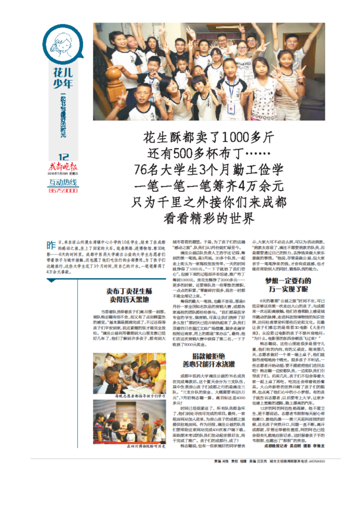 昨日,来自凉山州漫水湾镇中心小学的10名学生,结束了在成都的感动之旅,坐上了回家的火车。逛春熙路、进博物馆、看3D电影……8天的时间里,pp电子官方网站滴注公益的大学生志愿者们带着孩子与城市接触,还包揽了他们吃住行的全部费用。为了孩子们这趟旅行,这些大学生花了3个月时间,用自己的汗水,一笔笔筹得了4万余元善款。