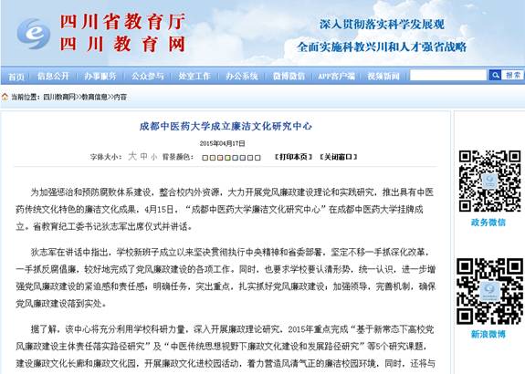 据了解,该中心将充分利用学校科研力量,深入开展廉政理论研究,2015年重点完成“基于新常态下高校党风廉政建设主体责任落实路径研究”及“中医传统思想视野下廉政文化建设和发展路径研究”等5个研究课题,建设廉政文化长廊和廉政文化园,开展廉政文化进校园活动,着力营造风清气正的廉洁校园环境,同时,还将与温江区委开展廉洁文化共建。