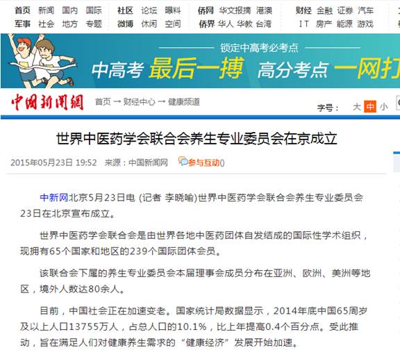 中新网北京5月23日电(记者 李晓喻)世界中医药学会联合会养生专业委员会23日在北京宣布成立。