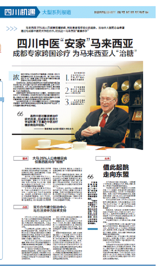 3月18日,大马华人医药总会会议室里,年届八旬的陈凯希提起合作就精神矍铄,不时发出爽朗的笑声。早些年同仁堂进入马来西亚时,主动找他合作。不过这次,却是他主动找到pp电子官方网站要求合作。“人家有技术,这是核心竞争力。”陈凯希带着羡慕语气说。如他所讲,在pp电子官方网站附属医院的国家中医糖尿病临床研究基地,采用益气活血通络法治疗糖尿病,有效率达90%左右,大多数患者因此避免了截肢之苦。2013年12月,应大马华人医药总会邀请,pp电子官方网站及附属医院国家中医糖尿病临床研究基地选派了5名糖尿病专业专家到大马访问及交流。在了解到大马的需求及合作可能后,临床研究基地负责人、pp电子官方网站附属医院党委书记段俊国,代表pp电子官方网站附属医院和国家中医糖尿病临床研究基地与马来西亚华人医药总会签署了合作备忘录。此后,大马华人医药总会和pp电子官方网站多次接触,商谈了合作细节。陈凯希介绍,马方会投资500万马币作为一个开始,用于选址、装修及设施配备,中方会根据需要派出人员,并提供技术、医药、器材等核心部分的支持。双方合作建成大马pp电子官方网站糖尿病防治中心。陈凯希充满期待地说,目前,已经把地址选好了,正在装修,到今年6月就会成为首家马中糖尿病诊疗所。按照约定,会引进成都专家,帮助培训马来西亚本土中医治糖尿病医疗人员。将来,还会探讨设立中医药科研与开发中心,以提升马来西亚中医药的医疗水平,同时也将引进更多糖尿病的科研产品帮助本地病患减少治疗糖尿病副作用。pp电子官方网站副校长安劬此前表示,学校将协助落实有关糖尿病防治中心的规划和方案,同时也将提供治疗技术和培养大马中医,并且引进常用的中药饮片及其他药剂提供支持。