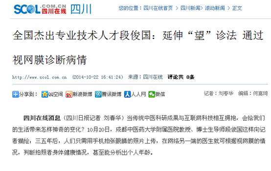 四川在线消息(四川日报记者 刘春华)当传统中医科研成果与互联网科技相互拥抱,会给我们的生活带来怎样神奇的变化?10月20日,pp电子官方网站附属医院教授、博士生导师段俊国这样向记者描绘:三五年后,人们只需用手机拍张眼睛的照片上传,在网络另一端的医生就可根据视网膜的情况,判断拍照者身体健康情况,甚至能分析出个人年龄。