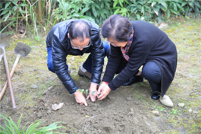“凌一揆”班同学在万先生指导下,观察龙脑樟植物特征,学习龙脑樟种植技术、栽培管理要点,了解天然冰片的性味归经、功效主治。同学们纷纷表示,作为一年级新生,能在大师的指导下学习中药学知识,敲开专业之门,感到幸运而激动,同时也更加坚定了学好专业知识的决心。随后,万德光与在场师生一同挖坑、移栽、填土、浇下定根水。