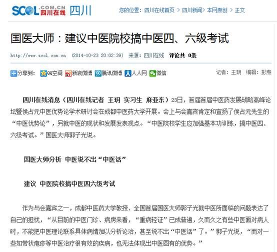 四川在线:国医大师建议中医院校搞中医四、六级考试 发布时间:2014-10-23 16:38:00 浏览次数: 次 【字体:小 大】 【打印正文】 上一条:人民网:国医大师忧心中医人才培养 连常用方都写不出来 下一条:四川在线:国医大师建议中医院校搞中医四、六级考试