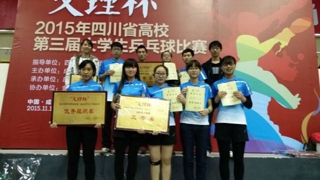 2015年四川省第三届高校大学生乒乓球比赛于11月14日至15日在成都文理学院举行,来自四川大学、电子科技大学、西南交通大学、西华大学、四川师范大学、西南石油大学、西华师范大学等36所高校近400名运动员参加比赛。pp电子乒乓球代表队10名运动员参加比赛,药学院陈栩夺得女子单打第5名,第二临床医学院余潇、体育学院宋城、莫桓、李宣运以及临床医学院叶广获得男子团体三等奖,来自管理学院的胥喜梅、第二临床医学院贺婉林、临床医学院梁雨晴、药学院陈栩、体育学院刘菊获得女子团体三等奖。体育学院教师陈远莉获