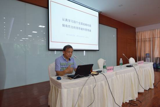 5月22日,党委副书记、副校长沈涛主持第三讲培训。省委党校杨静光教授作“学习四个全面战略布局,做有作为的领导者与管理者”专题辅导,杨教授系统阐释了四个全面战略布局以及科学内涵,并提出为践行四个全面,作为领导者和管理者,在经济新常态到政治新生态中,应树理想、立权威、强队伍、讲规矩和抓落实,在政治新生态到工作新状态中,护大局、顺民意、创绩效、守纪律、讲廉洁。
