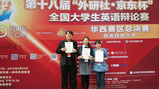 pp电子学生荣获第十八届外研社全国大学生英语辩论赛华西赛区总决赛三等奖 发布时间:2015-03-30 23:26:00 浏览次数: 次 【字体:小 大】 3月27日,第十八届“外研社·京东杯”全国大学生英语辩论赛华西赛区总决赛在西南名族大学举行,四川大学、西南交通大学、电子科技大学等54所高校代表队参加。决赛由五场辩论赛组成,比赛总得分决定各代表队的最终排名,获胜的前16支代表队将参加5月在北京举行的全国总决赛。pp电子代表队2013级中医专业学生梁光竣和2012级英语专业学生周乔在外语学院康静雯老师的指导下参加比赛,经过激烈角逐,最终以1分之差名列十七,荣获华西赛区总决赛三等奖。 (文、图/外语学院康静雯 编辑/王其奇 ) 【打印正文】 上一条:学校荣获成都市公安内保系统“平安示范单位”称号 下一条:pp电子学生荣获第十八届外研社全国大学生英语辩论赛华西赛区总决赛三等奖