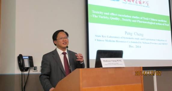 在香港大学访问期间,与香港大学中医药学院领导及专家进行了会谈。香港大学中医药学院方介绍学院历史与现状,对其人才培养的教育特色、教学模式、管理架构、承担人才培养任务以及科研等方面进行了介绍。彭成对“2011”西南道地药材协同创新中心的基本情况、组成单位、科学研究、人才培养、平台建设等进行了介绍,并邀请香港大学加入“2011”西南道地药材协同创新中心。双方就科研、人才培养等方面进行探讨,敲定合作方式:共同申请课题,以课题为载体联合培养研究生;双方专家互访,到对方学校授课,青年骨干进行访问学者交流,研究生互换培养;港大本科生到成都进行中药资源与鉴定实习实践等。彭成为港大师生以“有毒中药的毒-效关系研究”为题作了学术报告,分析附子的品种,品质,毒性和药效评价,并开展附子的临床应用、有效性、安全性以及控毒方法、机理等方面的讨论,反映热烈,受到高度评价。