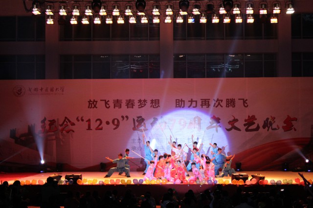 12月9日晚,由学校党委宣传部、学工部、校团委主办,校学生会承办的“放飞青春梦想,助力再次腾飞”纪念“12·9”运动79周年文艺晚会在温江校区体育馆拉开帷幕,校领导马跃荣、沈涛、余曙光、延建明、徐廉及各职能部门、学院领导、老师共计2000多名师生观看演出。