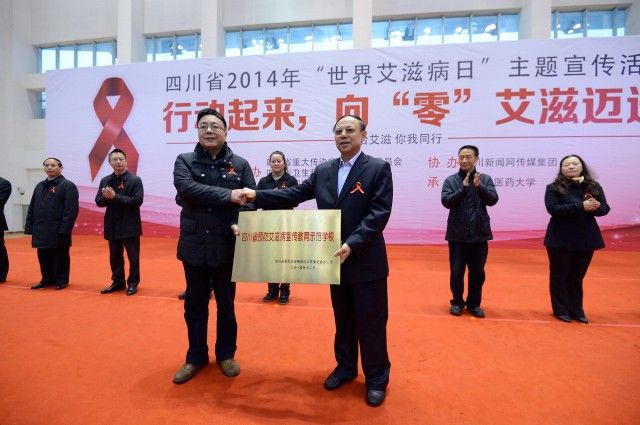 陈文华,省卫生计生委党组书记、主任沈骥为pp电子官方网站和西昌学院预防艾滋病宣传教育示范学校授牌,沈涛代表学校接牌。