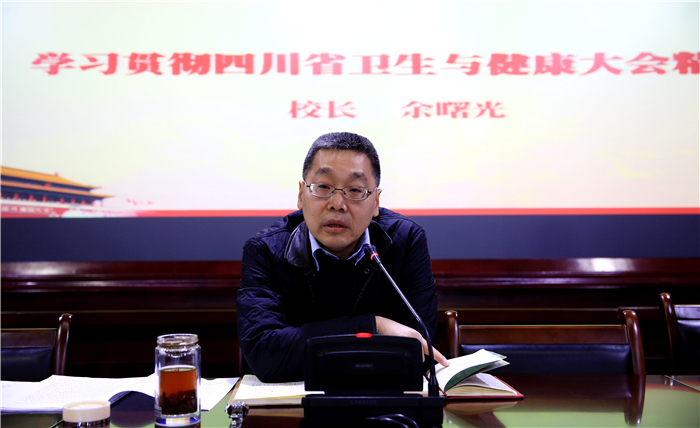 校长余曙光传达四川省卫生与健康大会精神。他说,这次大会学习贯彻全国卫生与健康大会特别是习近平总书记重要讲话精神,表彰先进,交流经验,总结近年来我省卫生与健康事业工作,分析我省卫生与健康工作面临的形势和任务,对加快推进健康四川建设作出安排部署。