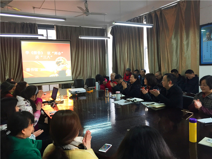 3月8日上午,图书馆在十二桥校区开展了学《报告》,议“两会”,庆“三·八”主题活动,馆长赵琼主持会议,代表班子成员向全馆女同胞表达了节日的祝福,也请男同胞转达对他们另一半的祝福。