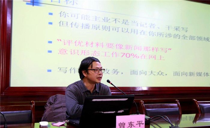 学校举行宣传工作业务培训会 发布时间:2016-12-22 10:05:00 浏览次数: 次 【字体:小 大】 12月21日下午,学校宣传工作业务培训会在温江校区行政楼第五会议室举行,四川日报《川报观察》客户端主编曾东平应邀为宣传部工作人员和学校全体宣传员作培训讲座。培训会由党委宣传部部长赖玉萍主持。 曾东平以自己长期在新闻工作第一线的经验为基础,以现代传播学理论为指导,结合大量生动贴近的案例,以新闻的特性和价值、新闻工作者的追求与素质、写好新闻的方法等论题为主要内容,并通过让大家修改稿件、选择图片等互动方式,为大家作了一场丰富精彩的新闻宣传业务培训。 (文/校报记者站 张宇 图/庞利红 编辑/刘承云) 【打印正文】 上一条:学校举行宣传工作业务培训会 下一条:pp电子被评为成都市武术运动协会先进单位