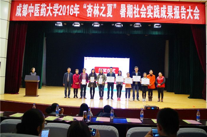 11月17日下午,学校2016年“杏林之夏”暑期社会实践成果报告大会在百会堂演播大厅举行。学生处、校团委、针灸推拿学院、医学技术学院、医学信息工程学院相关领导和老师及得荣县人大常委会主任阿郎出席了报告会。来自各实践小分队的代表及四川农业大学学生代表近400人参加了会议。