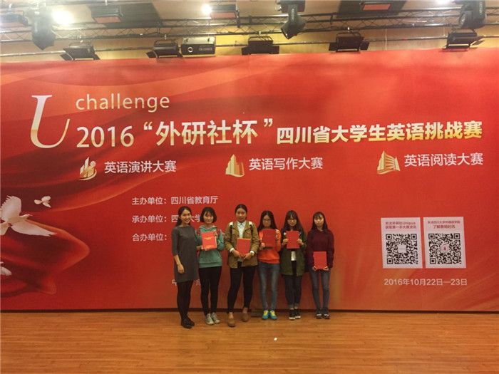 10月23日,2016“外研社杯”四川省大学生英语挑战赛在四川大学望江校区举行。大赛由四川省教育厅主办,四川大学、外语教学与研究出版社承办,包含英语演讲大赛、英语写作大赛和英语阅读大赛三项赛事,共有40所川内高校100多人参赛。pp电子外语学院学生曹圆梦、钟燕梅、李琴莹,护理学院学生杨倩瑜,第二临床医学院学生杨梦颖在外语学院教师孟悦的带领下参加比赛,分别获得英语演讲比赛三等奖一项,英语写作、阅读比赛三等奖各两项的好成绩。