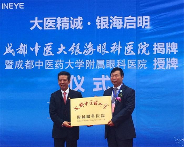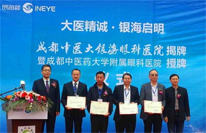 在喜庆的音乐声中,各级领导、院士、著名眼科专家和眼科医院院长共同为“成都中医大银海眼科医院”揭牌。马跃荣代表学校向段俊国授予“pp电子官方网站附属眼科医院”院牌。同时,马跃荣、余曙光向新聘任的眼科学院12位专家分别颁发了名誉教授、客座教授、兼职教授等聘书。