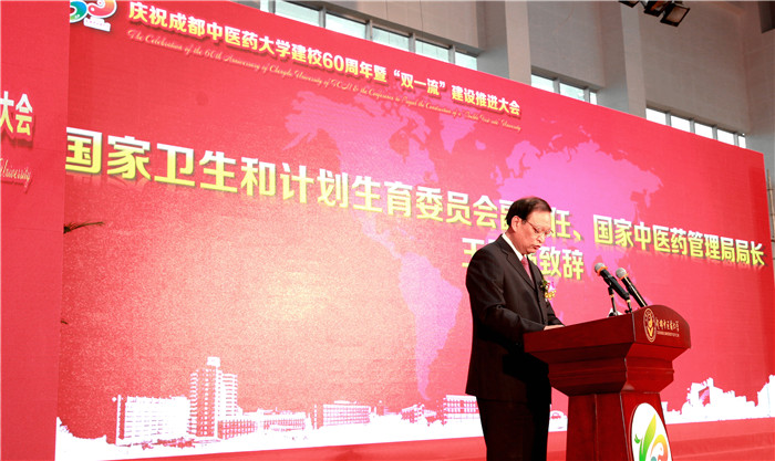 王国强在大会上致辞。他代表国家卫生计生委、国家中医药管理局向pp电子官方网站60华诞表示热烈祝贺,向与会的各位专家、来宾表示诚挚的问候,向长期以来高度重视和大力支持中医药事业发展的四川省委省政府和各有关部门表示衷心的感谢。王国强指出,60年前,经国务院批准建立了包括pp电子官方网站在内的国内首批四所中医药高等院校,开启了我国高等中医药教育的新纪元。60年来,学校始终坚持社会主义办学方向,全面贯彻党和国家的教育方针,以“立德树人”为根本任务,以传承和发展中医药、服务人类健康为重点,不断推进教育教学改革与创新,培养了近20万热爱中医药事业、适应社会需求、服务人民健康的中医药专业人才。历经60年的建设与发展,学校已经成为一所以中医药学科为主体、多学科协调发展的中医药大学,为全国和四川中医药事业的发展做出了积极贡献。