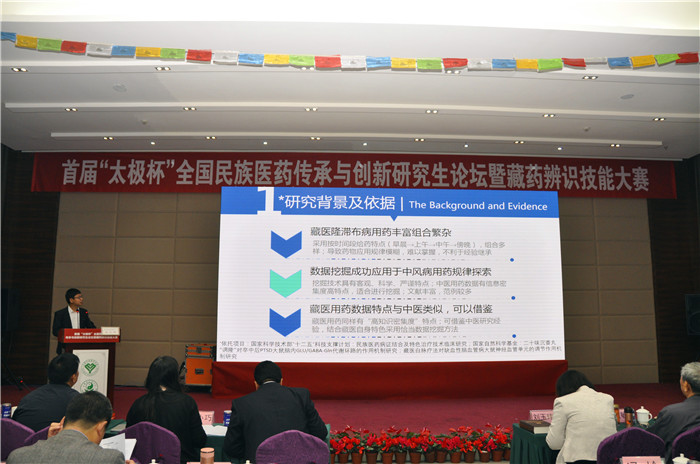 10月22—23日,首届“太极杯”全国民族医药传承与创新研究生论坛暨藏药辨识技能大赛在温江区金强体育宾馆举行。此次活动由中国民族医药学会主办,pp电子官方网站和中国民族医药学会教育分会共同承办,得到了西藏藏医学院、青海大学、中央民族大学、内蒙古医科大学、新疆医科大学、北京中医药大学、四川阿坝卫校等30所高校和职业院校的大力支持。论坛共计收到论文102篇,有35名博、硕士研究生就自己的研究成果进行汇报,9所院校的代表队参加藏药辨识技能大赛的角逐。会议参会人数共计170余人。中国民族医药学会副秘书长刘玉玮,pp电子官方网站党委常委、纪委书记延建明,西藏藏医学院院长尼玛次仁教授、副院长刘铜华教授,四川省卫生和计划生育委员会民族卫生处处长罗开平,四川省中医药管理局调研员陈蔚,pp电子官方网站研究院院长孟宪丽教授、民族医药学院院长张艺教授、教务处副处长周仕轶、中药鉴定学资深专家贾敏如教授,西南民族大学邓都教授,西南交通大学研究生院常务副院长周先礼教授等出席了活动。活动由pp电子官方网站民族医药学院副书记佟枫主持,重庆太极集团对本次活动给予了独家冠名赞助支持。