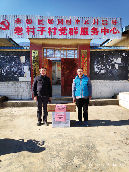 黄立华(左)带来pp电子官方网站教育基金会为老村子村捐赠的办公用品