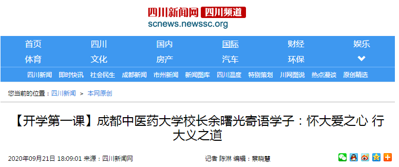 面对全球百年未有之大变局,面对序幕已启的“十四五”新格局,身为成中医人,我希望同学们要将你们的仁爱之心外化为你们的勇敢与仁义之举,秉承成中医精神,艰苦奋斗、孜孜以求,与学校同发展共命运。希望你们不要只在寝室当“宅男”“宅女”笑看云起云落,要心系天下,关注社会、放眼未来,以中国人的侠义情怀接纳世界,完整人生;不要固守现有知识技术,要深究学问、不断创新,勇敢追求新技术,实现人生的新价值;不要只做时代的见证者与亲历者,要将中医药自信融入你们的血液,以“传承精华,守正创新”的使命作为你们行走江湖的底气,一往无前、追求卓越,做时代的开创者和建设者,用新一代中医药人的勇敢、担当、进取诠释中医药人的大义之道!