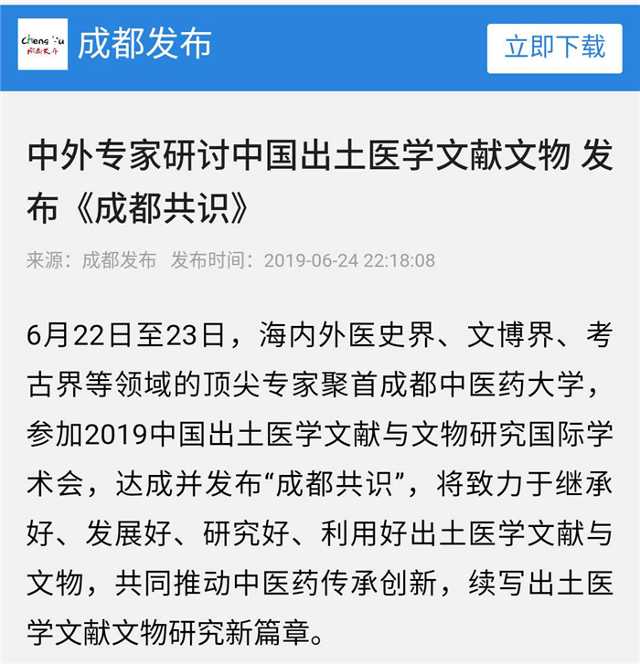 6月22日至23日,海内外医史界、文博界、考古界等领域的顶尖专家聚首pp电子官方网站,参加2019中国出土医学文献与文物研究国际学术会,达成并发布“成都共识”,将致力于继承好、发展好、研究好、利用好出土医学文献与文物,共同推动中医药传承创新,续写出土医学文献文物研究新篇章。
