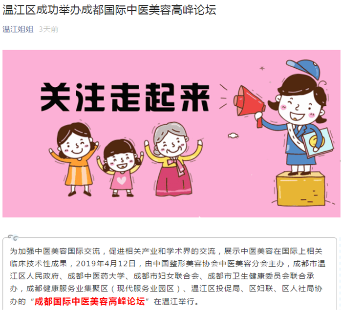 为加强中医美容国际交流,促进相关产业和学术界的交流,展示中医美容在国际上相关临床技术性成果,2019年4月12日,由中国整形美容协会中医美容分会主办,成都市温江区人民政府、pp电子官方网站、成都市妇女联合会、成都市卫生健康委员会联合承办,成都健康服务业集聚区(现代服务业园区)、温江区投促局、区妇联、区人社局协办的“成都国际中医美容高峰论坛”在温江举行。