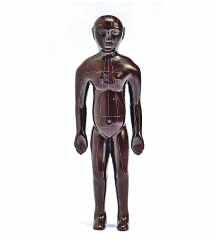 与天回医简一同出土的人体经穴漆人漆色光亮如新,各部比例适宜,人像的五官、肢体刻画准确,经络线条清晰完整。在这个14厘米高的漆人像上,119个穴位点清晰可见,22条红色经脉与29条白色经脉相互交织,不同位置刻画着“心”“肺”“肾”“盆”等字。