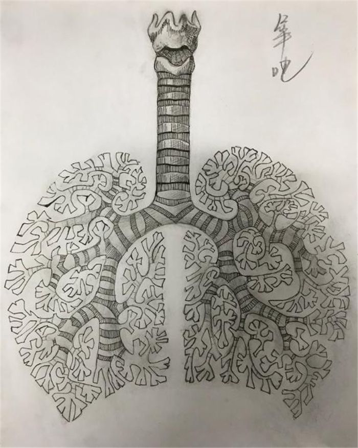 杨可欣的作品《循环之轨》在比赛中获得了一等奖,她说,“由于本身的专业,我们对于人体解剖更加了解。我在绘画时一边写实,一边想象。左边是人体正常的血液循环轨道,右边是火车轨道,心脏是整个循环的核心,供给着整个身体所需的营养物质和氧气等,就像一个能量站一样,连接着的血管将血液运送到身体各处就像火车轨道一样,连接着世界各地也汇集着世界各地。”