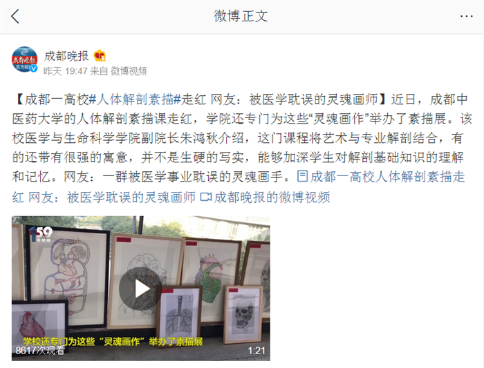 【成都一高校#人体解剖素描#走红 网友:被医学耽误的灵魂画师】近日,pp电子官方网站的人体解剖素描课走红,学院还专门为这些“灵魂画作”举办了素描展。该校医学与生命科学学院副院长朱鸿秋介绍,这门课程将艺术与专业解剖结合,有的还带有很强的寓意,并不是生硬的写实,能够加深学生对解剖基础知识的理解和记忆。网友:一群被医学事业耽误的灵魂画手。