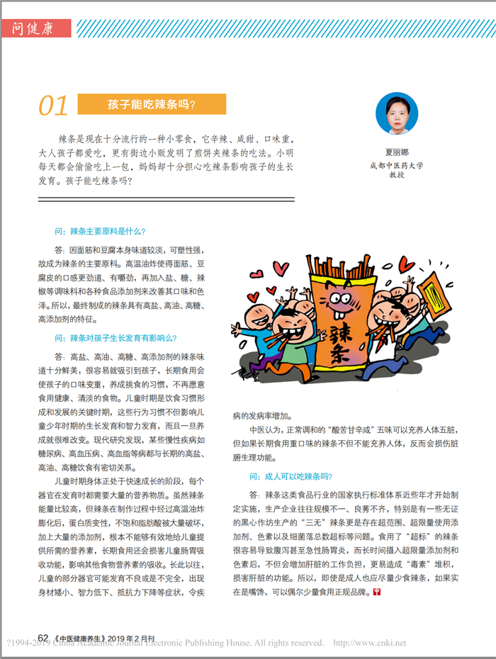 《中医健康养生》:孩子能吃辣条吗(养生康复学院 夏丽娜) 发布时间:2019-02-27 00:00:00 浏览次数: 次 【字体:小 大】 《中医健康养生》杂志是由国家中医药管理局主管、《中国中医药报》社主办、全国发行的权威中医科普月刊,依托中医药行业权威丰富的信息和国家级专家资源库,向广大读者提供权威、科学、地道的中医养生保健知识和技能,弘扬优秀中医养生文化,正确引导养生保健舆论。2019年第二期特约pp电子养生康复学院夏丽娜教授撰写科普文章。 【打印正文】 上一条:《四川日报》:“互联网+中医药扶贫”增加贫困地区村民收入 下一条:《中医健康养生》:胖大海不止能利咽护嗓(药学院 徐世军)