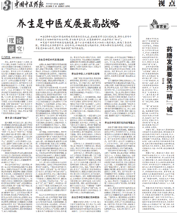 养生,是中华民族的一大创造,在中华大地上有着数千年的历史,是中华文明有关健康长寿的理论及实践体系,是中华民族特有的文化现象和独特的民族追求。养生是立足于生命规律,研究实现人类健康长寿的体系,在其发展过程中,逐渐与中医融合、接受中医指导,成为中医学的重要组成部分。尤其在当下,全球关注健康的背景下,养生日益焕发出勃勃生机,是中医学对人类健康事业做出的又一大贡献。鉴古思今,治有限而病无涯,“以有涯随无涯,殆矣”。可见,若思路限于“医”字而亦步亦趋于无穷的疾病变化,显然是不明智的,更不应成为中医的唯一发展之路。“人之情,莫不恶死而乐生”,中医从诞生之日起,其出发点和着眼点即非消灭疾病,而是思考和解决健康、长寿的问题,实现“却病延年”“百岁而动作不衰”的最高目标,这一目标,对现代社会尤具有重要意义。何种学术能实现这一目标?唯养生也!因此,养生诚可谓中医发展的最高之战略!