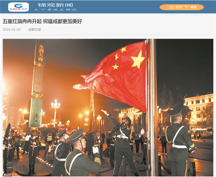 晨曦微露,东方欲晓。告别非凡与难忘的2018年,2019年1月1日清晨,天府广场上,数千名群众在清冽的寒风之中满怀激动,翘首等待火红的国旗温暖心窝的那一刻。伴随着慷慨激昂的国歌声,鲜艳的五星红旗在天府广场上空冉冉升起,迎来了新年第一缕阳光。随着五星红旗升至旗杆顶端的一刻,大家在心中默默地许下了对新的一年美好的期盼:希望祖国更加繁荣昌盛,希望成都越来越美好!