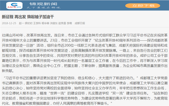 壮阔山河40年,改革开放再出发。连日来,市总工会通过各种方式组织职工群众学习习近平总书记在庆祝改革开放40周年大会上的重要讲话。23日,市总工会组织开展了“纪念改革开放40周年系列活动——探访成都改革开放发展足迹一日游”活动,组织全市近200位一线职工代表走进成飞集团、成都天府国际机场建设现场和成都规划馆,探访成都改革开放40年发展足迹,近距离触摸改革开放发展脉搏。一路上,来自各行各业的职工们互相交流,分享各自生活中的变化,共同抒发对美好生活的向往和对改革开放40年的体会。成钞公司工会干部夏艳红表示,作为与改革开放同一时代成长起来的一名基层工会工作者,在今后的工作中,将不断深入学习政治理论及业务知识,围绕企业中心工作,把握主题,不断创新,提高服务质量,为企业和城市高质量发展作出新贡献。