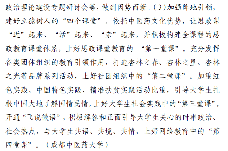 学校把立德树人融入思想道德教育、文化知识教育、社会实践教育各环节。我们将立德树人贯穿在大学生生活和学习始终,建好“四个课堂”。一是在基础课堂教育中,上好“第一堂课”。学校充分发挥好思想政治理论课主渠道、主阵地作用,依托中医药文化优势,让思政课“近”起来、“活”起来、“亲”起来,书记和校长定期开展“与青年学生面对面”的活动,与同学们共话校园生活,畅谈家国情怀。二是在学生社团组织中,上好“第二堂课”。不断加强和改进共青团工作,打造主题鲜明、充满正气与活力的杏林之春、杏林之星、杏林之光等品牌系列活动,从本科生、研究生中遴选“校长学生助理”, 促进学生积极参与学校管理,。三是在大学生社会实践中,上好“第三堂课”。加重红色实践、中国特色实践、精准扶贫实践活动比重,多次开展博士服务团大型义诊活动,增强社会责任感和使命感,引导大学生扎根中国大地了解国情民情,实现人生价值。四是在大学生网络教育中,上好“第四堂课”。积极推进学校官方微博微信建设,打造“飞说微语”品牌思政教育微信平台,引导大学生关注时事政治、社会热点、校园新闻,通过微博、微信等新媒体进行解答回应和正向引导,与大学生“共语”“共境”和“共情”,做好“互联网+思想引领”这篇文章。