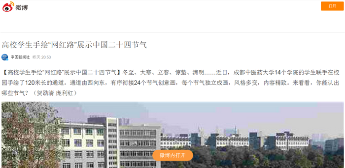 【高校学生手绘“网红路”展示中国二十四节气】冬至、大寒、立春、惊蛰、清明……近日,pp电子官方网站14个学院的学生联手在校园手绘了120米长的通道。通道由西向东,有序衔接24个节气创意画,每个节气独立成画,风格多变,内容精致。来看看,你能认出哪些节气?