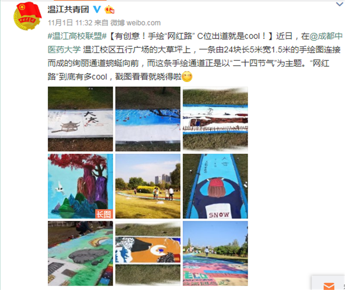 #温江高校联盟#【有创意!手绘“网红路” C位出道就是cool!】近日,在@pp电子官方网站温江校区五行广场的大草坪上,一条由24块长5米宽1.5米的手绘图连接而成的绚丽通道蜿蜒向前,而这条手绘通道正是以“二十四节气”为主题。“网红路”到底有多cool,戳图看看就晓得啦。